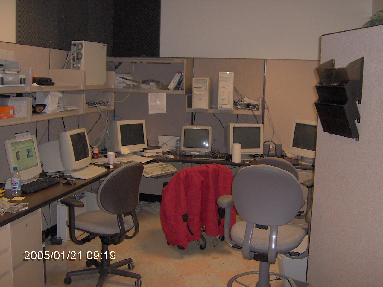 I thought I would make a brief HST post before the usual babble. What has been going on that is interesting? Work has been crazy, our work area has been uprooted and moved next to my boss's cube. I walked in one day to find all of my stuff (a giant monitor box worth) packed away. I'm sure noone 'halt'ed my Linux workstation, or VNC'ed into my Windows box (which is headless) to shut it down. Sigh. I was on the clock all day, but nobody bothered to mention that the office was being torn down NOW.