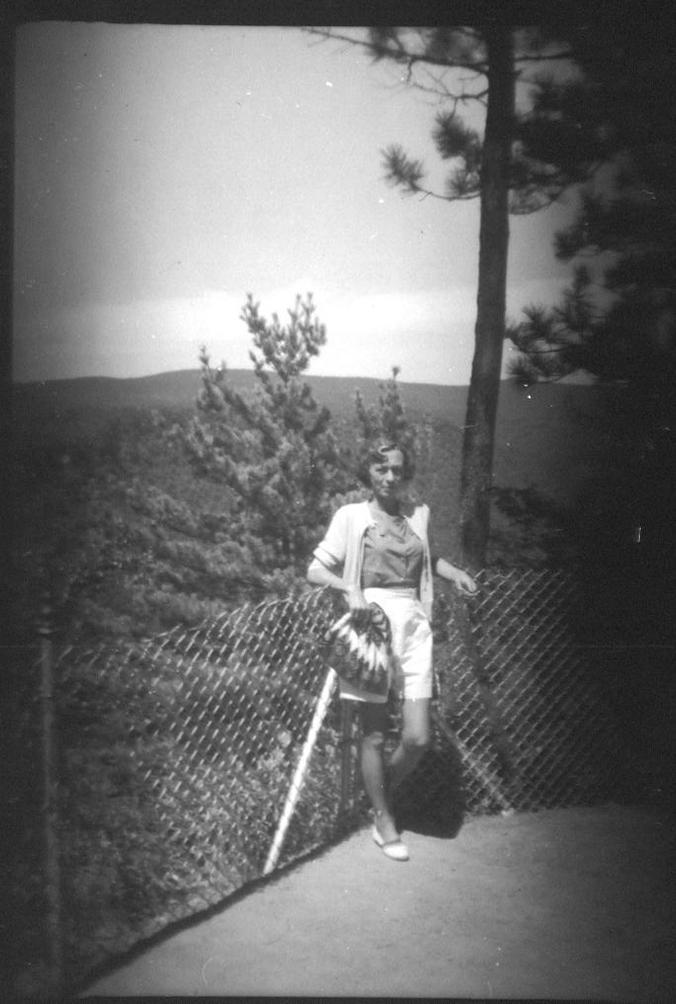 This is Mrs. Walter Brett on a trip with her husband. The picture is a scan of part of a contact proof sheet. This is one of two usable pictures from a roll of 620 film left inside an old, folding Kodak camera that was in Walter's estate.